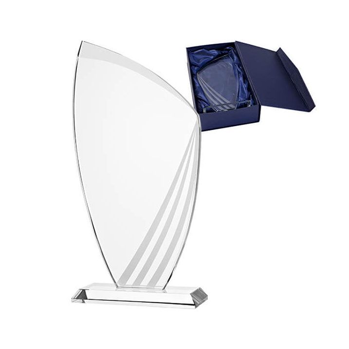 Diese Glas-Trophäe ist bei Budgetpokale in 3 verschiedenen Größen erhältlich. Das Glas ist an der rechten Seite mit 3 zierlichen, matten Glasstreifen versehen, was ihm eine schöne Ausstrahlung verleiht. Sie können das Glas individuell lasern lassen. Laden Sie Ihr eigenes Bild, Logo und/oder einen Text hoch und Budgetpokale wird innerhalb von 24 Stunden nach der Auftragsbestätigung ein Muster zur Bestätigung senden.