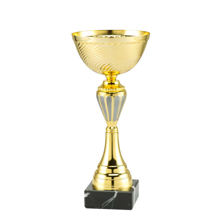 Dieser Goldpokal ist bei Budgetpokale in 12 verschiedenen Größen verfügbar. Ideal, wenn Sie einen Pokal in verschiedenen Größen suchen. Das Mittelstück ist mit schönen grauen Akzenten versehen. Auf dem schwarzen Sockel kann ein Textschild angebracht werden, um den Pokal persönlich zu gestalten.