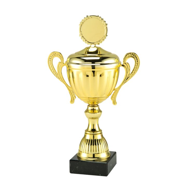Diesen goldenen Pokal gibt es bei Budgettrophy in acht verschiedenen Größen vorrätig. Die Größen variieren von 27,5 cm bis 42,5 cm. Der goldene Pokal ist auf einem schwarzen Marmorblock befestigt und bietet die Möglichkeit, eine (Sport-)Abbildung mittig auf dem Deckel platzieren zu lassen. Außerdem können Sie den Sockel mit einem Textschild mit Ihrem eigenen persönlichen Text versehen lassen. Budgettrophy führt die Montage der Abbildung und des Textschilds gratis für Sie aus! Sie sind auch an einem Kelch interessiert?
