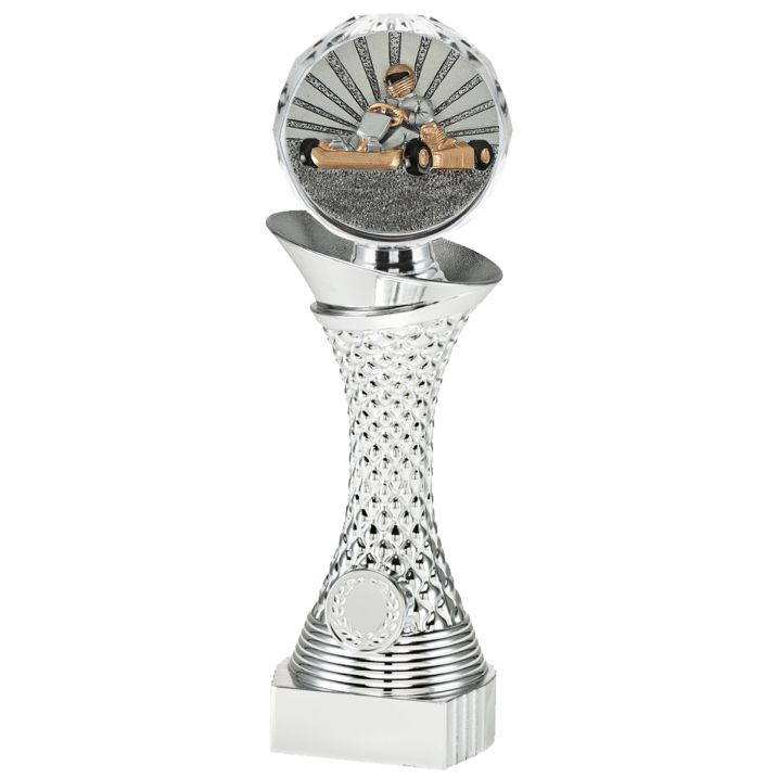 Dieser Silberpokal ist bei Budgetpokale in 3 verschiedenen Größen verfügbar. Die Oberseite des Pokals ist mit einer schönen karting-Disc versehen und unten ist Platz für eine eigene Abbildung und ein Textschild! Sie können ein eigenes Design für die Abbildung hochladen. Oder eine unserer Abbildungen auswählen. Die Montage des Pokals wird von Budgetpokale gratis ausgeführt.