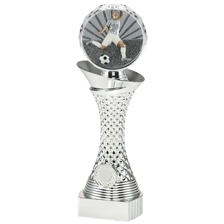 Diese silberfarbene Fußball-Trophäe ist bei Boccale in drei verschiedenen Größen erhältlich. Auf der Oberseite befindet sich eine Fußball-Disc, wodurch dieser Pokal ideal für Fußballturniere, Vereinsmeisterschaften oder andere sportliche Auszeichnungen geeignet ist. Am unteren Teil der Trophäe ist Platz für eine eigene Abbildung sowie ein individuelles Textschild. Sie können dafür ganz einfach ein eigenes Design hochladen oder aus einer Auswahl vorhandener Motive wählen. Boccale übernimmt die Montage der personalisierten Elemente kostenlos.