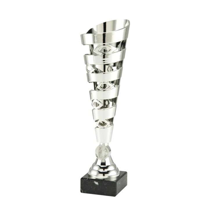Diese elegante silberfarbene Trophäe ist in drei Größen erhältlich und besticht durch filigrane, offene Details, die für eine hochwertige und luxuriöse Optik sorgen. Dank ihres neutralen Designs eignet sie sich für jede Art von Veranstaltung oder Sportwettbewerb.